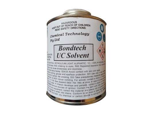 Bondtech UC Solvent is a mild solvent used as a cleaner for metal parts and of contact adhesives from leather uppers. It is also used for thinning Rubber Cement Adhesive.