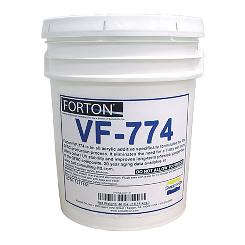 Forton™ VF-774 is an all acrylic, co-polymer dispersion (51% solids) specifically formulated for the GFRC production process. VF-774 is UV stable. It is further formulated to be stable and durable in the high pH Portland cement-based GFRC composite.